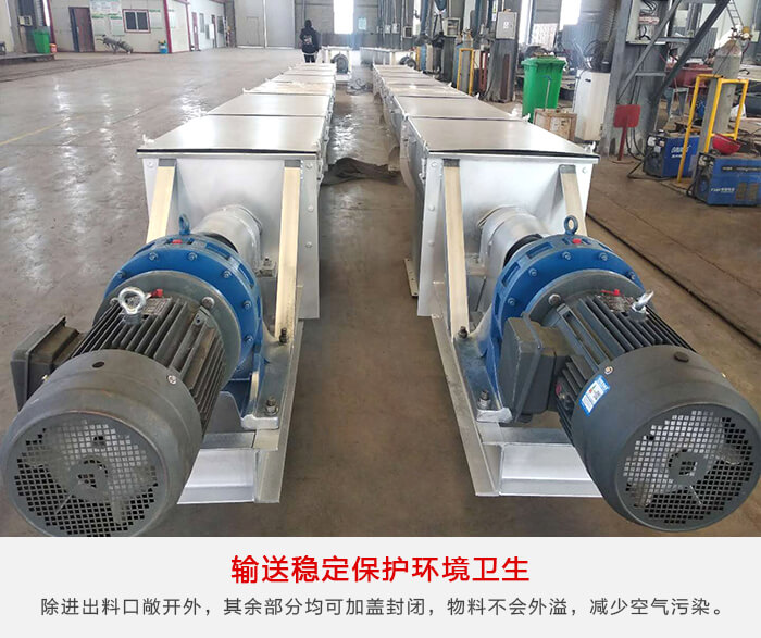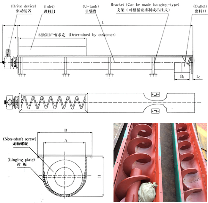 無軸螺旋絞龍輸送機由無軸螺旋、U型槽、襯板、蓋板、進出口和驅(qū)動裝置組成。