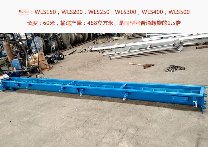 無軸螺旋輸送機常規型號有WLS150,WLS200,WLS250,WLS300,WLS400,WLS500等6種規格可選,單機長度60米,輸送產量高達458立方米,是同型號普通螺旋的1.5倍;可輸送帶狀、黏稠物料、易纏繞物料;具體參數如下: