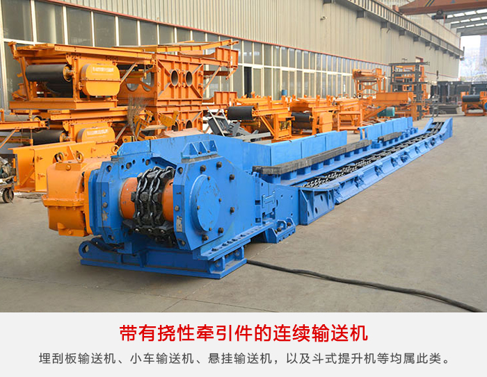 帶式輸送機、鏈板輸送機、刮板輸送機、埋刮板輸送機、小車輸送機、懸掛輸送機,以及斗式提升機等均屬此類。其工作特點是把物品置于承載件上,由撓性牽引件搬運承載件沿著固定的線路運動,靠物品和承載件的摩擦力使物品與牽引件在工作區段上一起移動。